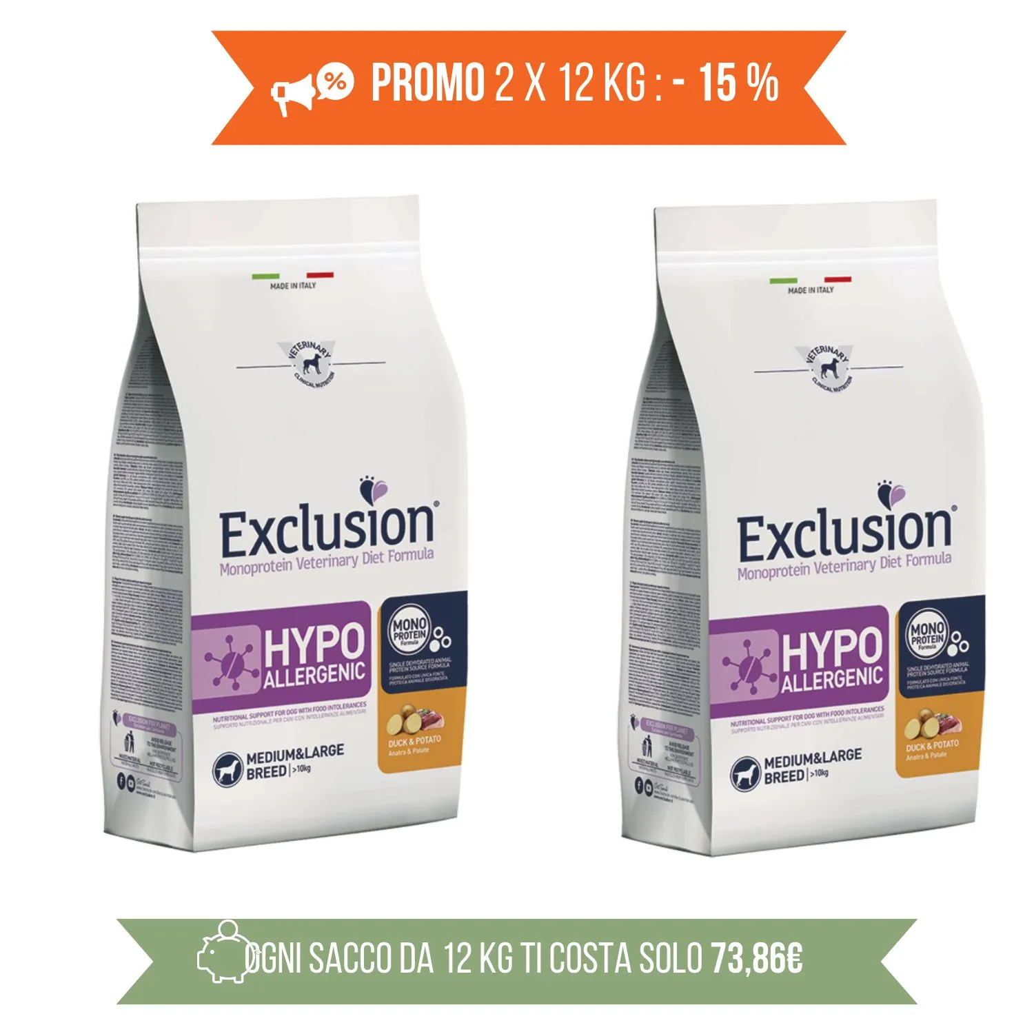 Exclusion Diet Hypoallergenic Medium Large Anatra e Patate Monoproteico per Cani, alimento completo dietetico con formulazione monoproteica animale per cani taglia media-grande (peso corporeo >10kg) con intolleranza alimentare.