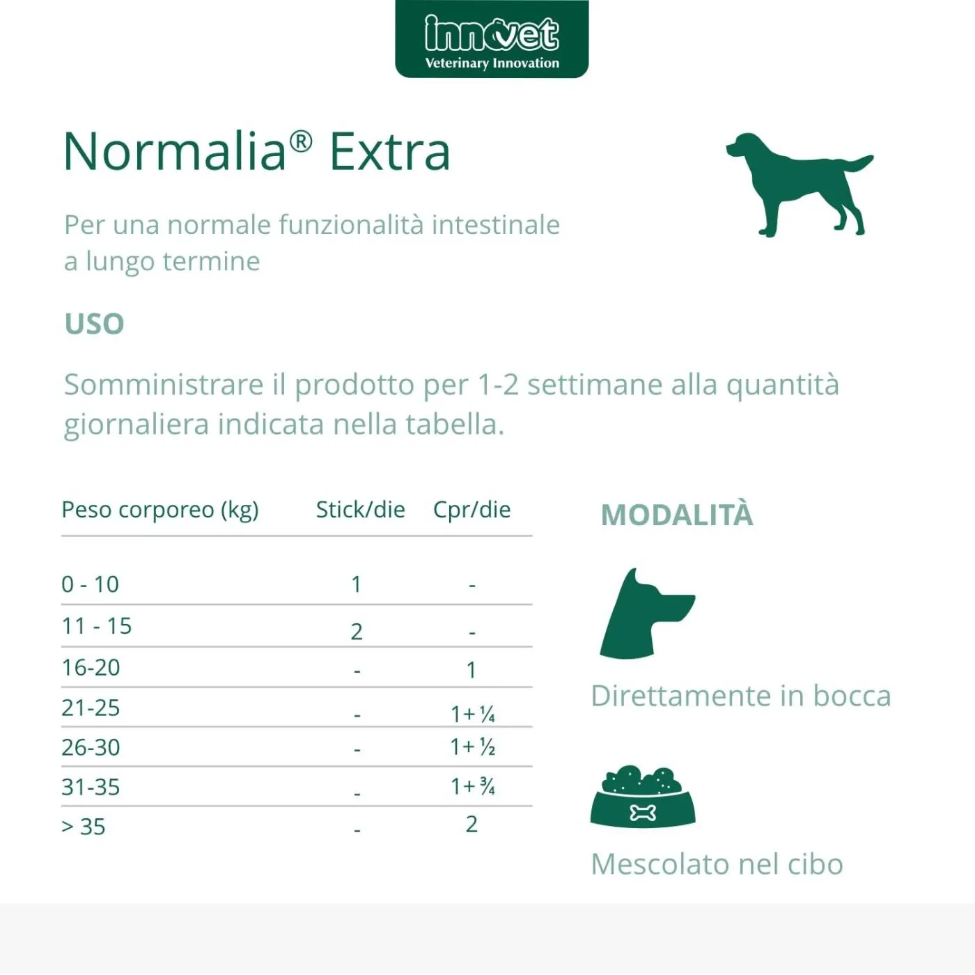 Somministrare il prodotto per almeno 30 giorni alla quantità indicata in tabella.