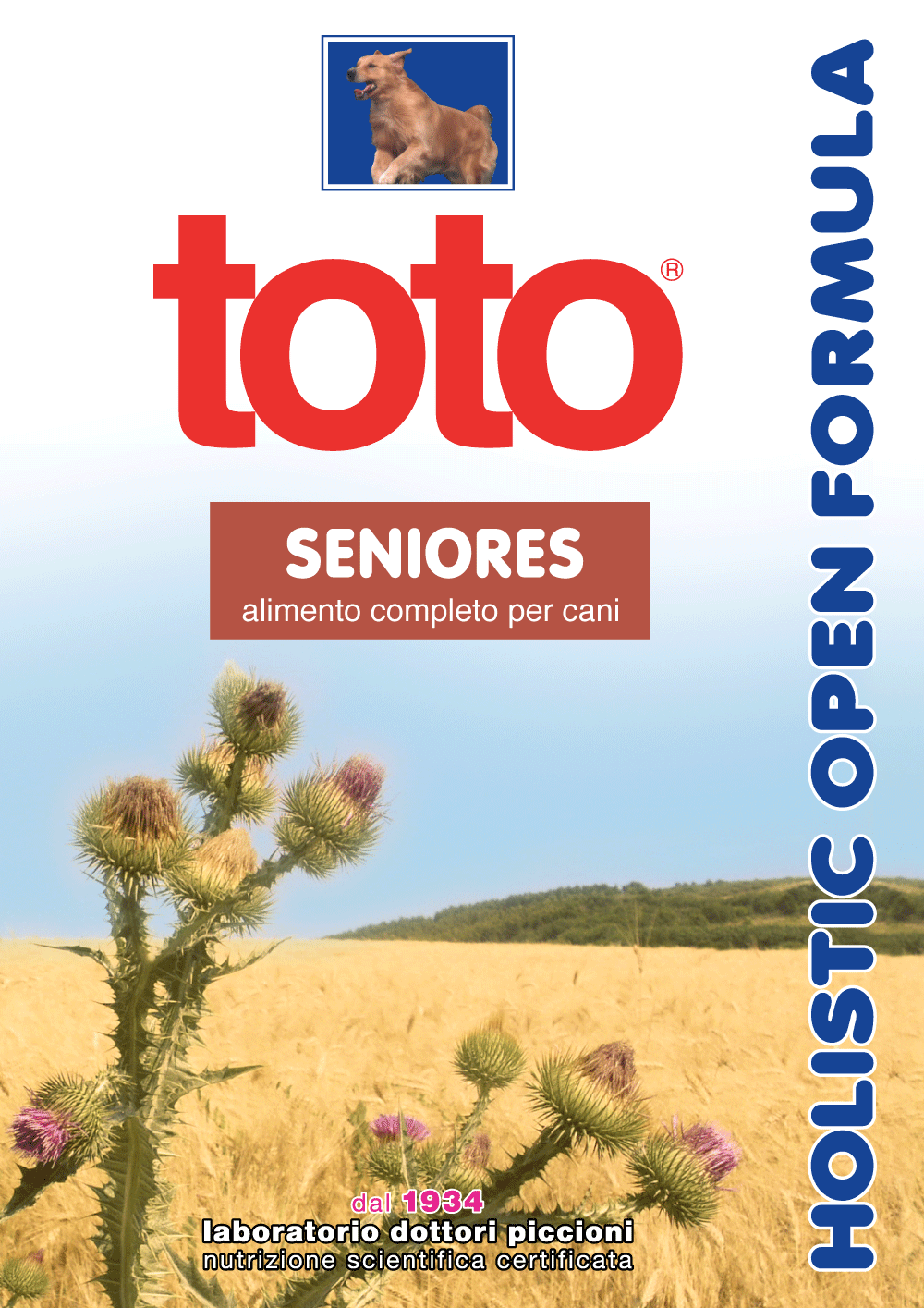 Toto Holistic Open Formula“Seniores” è un mangime secco completo per cani da 5/6 anni in poi in normale attività.