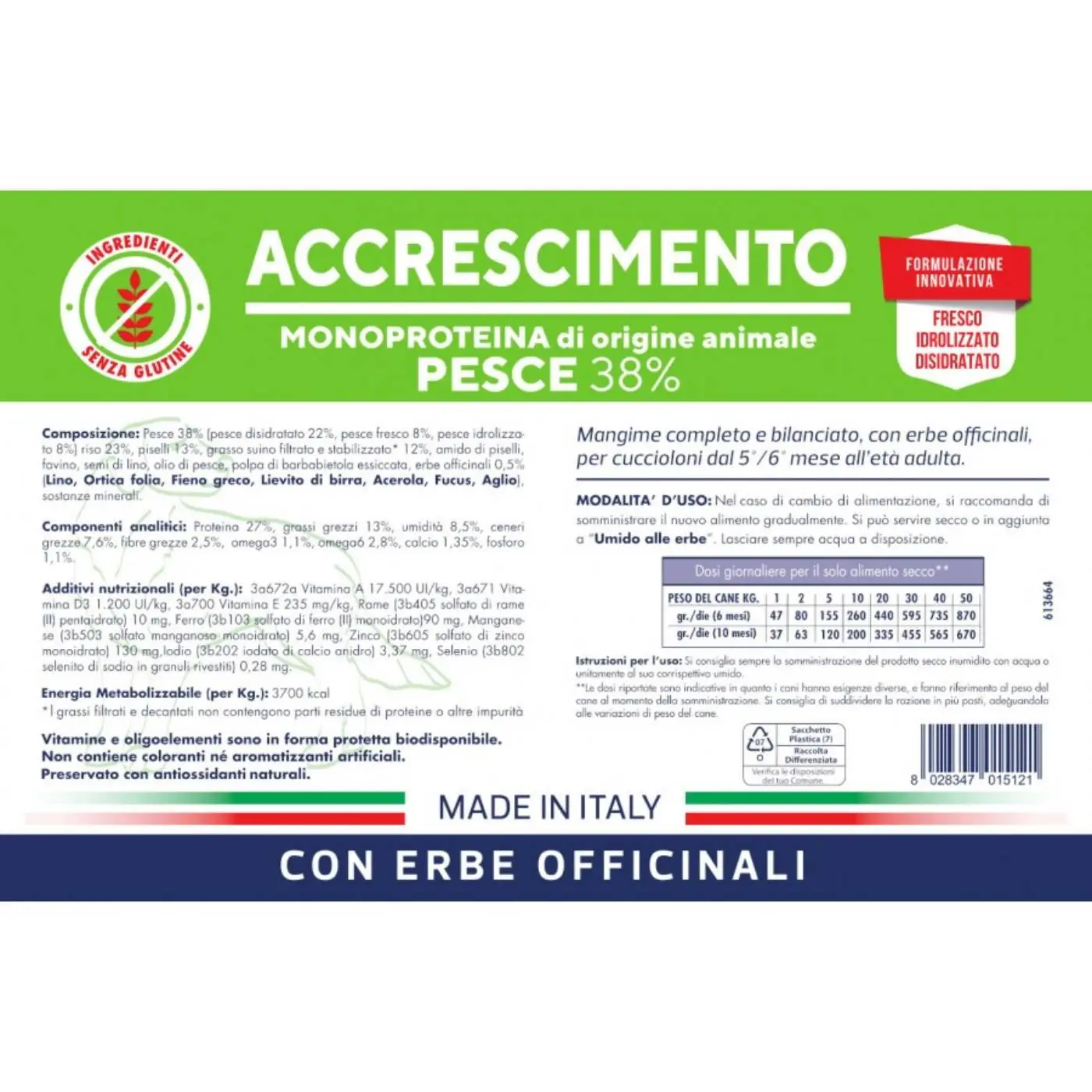 Vet Line Accrescimento Pesce per Cuccioli Monoproteico è un mangime secco completo e bilanciato, con erbe officinali studiato per le esigenze nutrizionali dei cani cuccioli dai 5-6 mesi allâetĂ adulta.