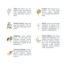 erbe officinali 0,5% (Lino, Ortica Folia, Fieno greco, Lievito di birra, Acerola, Fucus, Aglio)