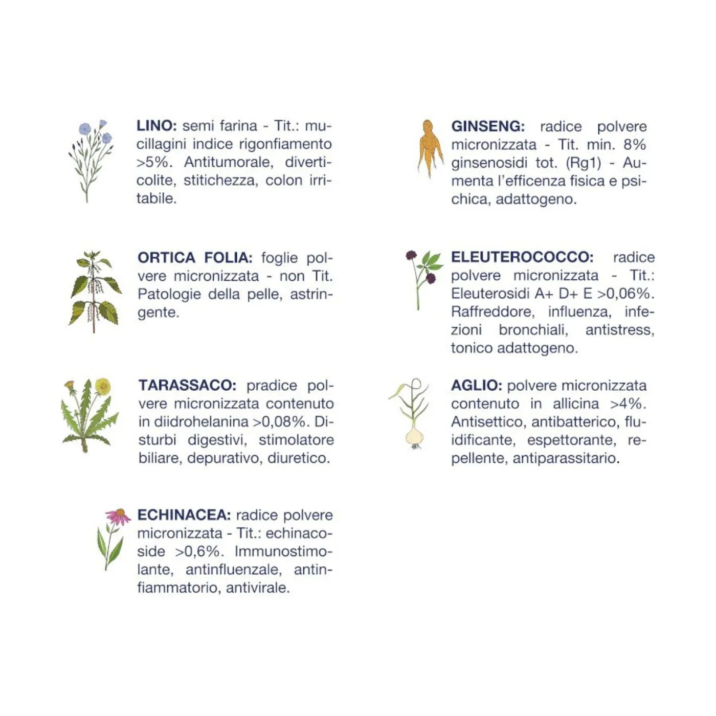 .erbe officinali 0,5% (Lino, Ortica Folia, Tarassaco, Eleuterococco, Echinacea, Ginseng, Aglio)