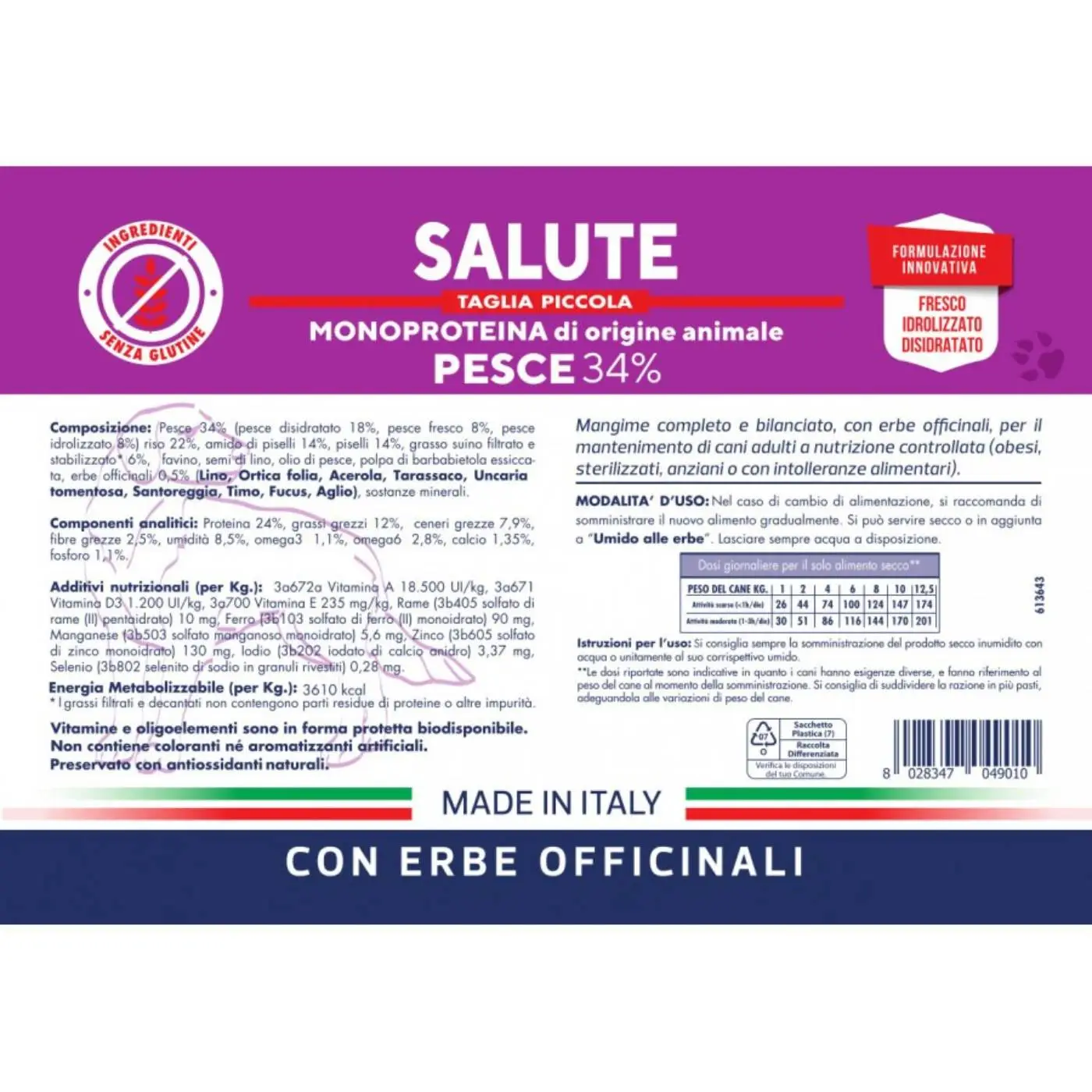 Unica fonte proteica pesce fresco, disidratato e idrolizzato.