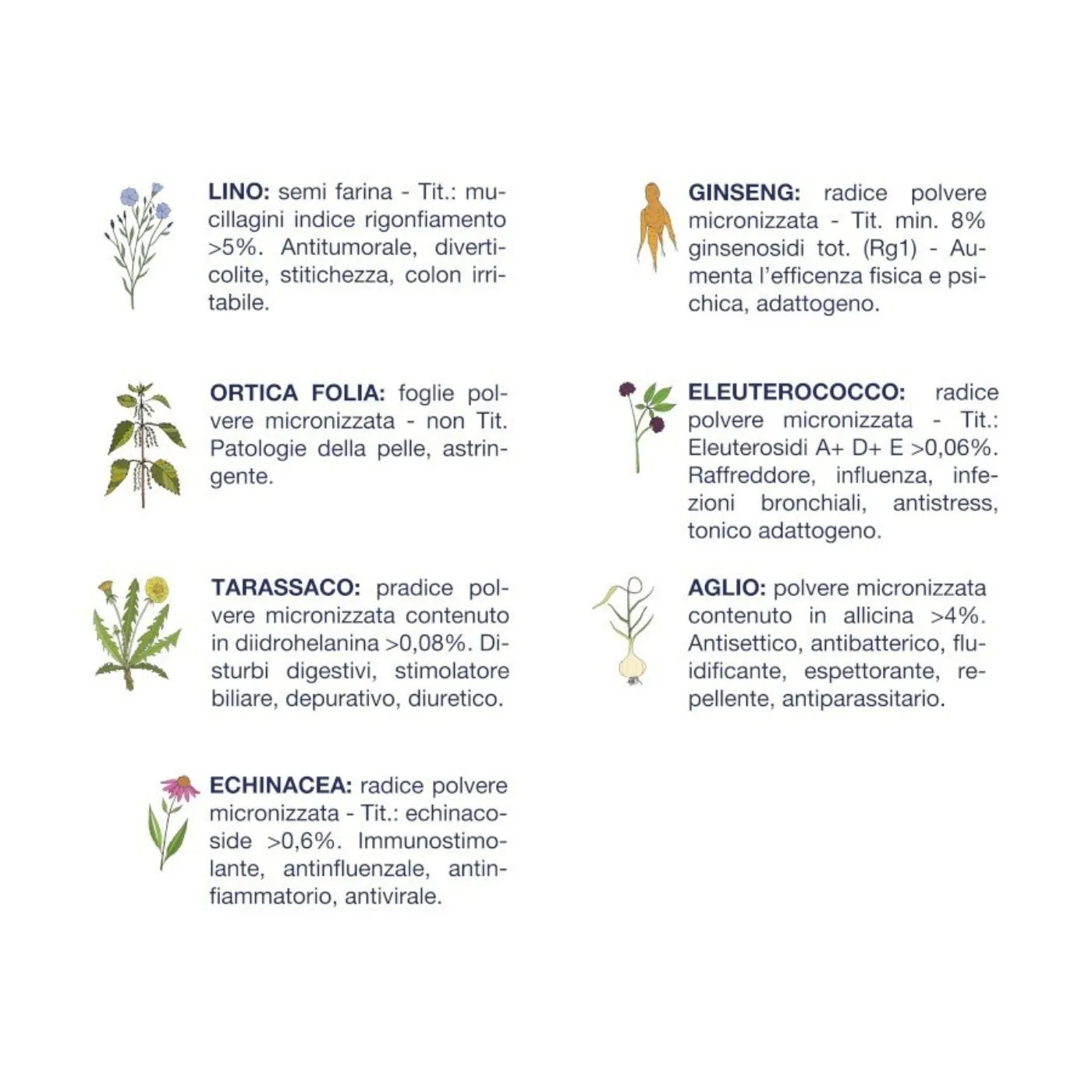 .erbe officinali 0,5% (Lino, Ortica folia, Tarassaco, Eleuterococco, Echinacea, Ginseng, Aglio)