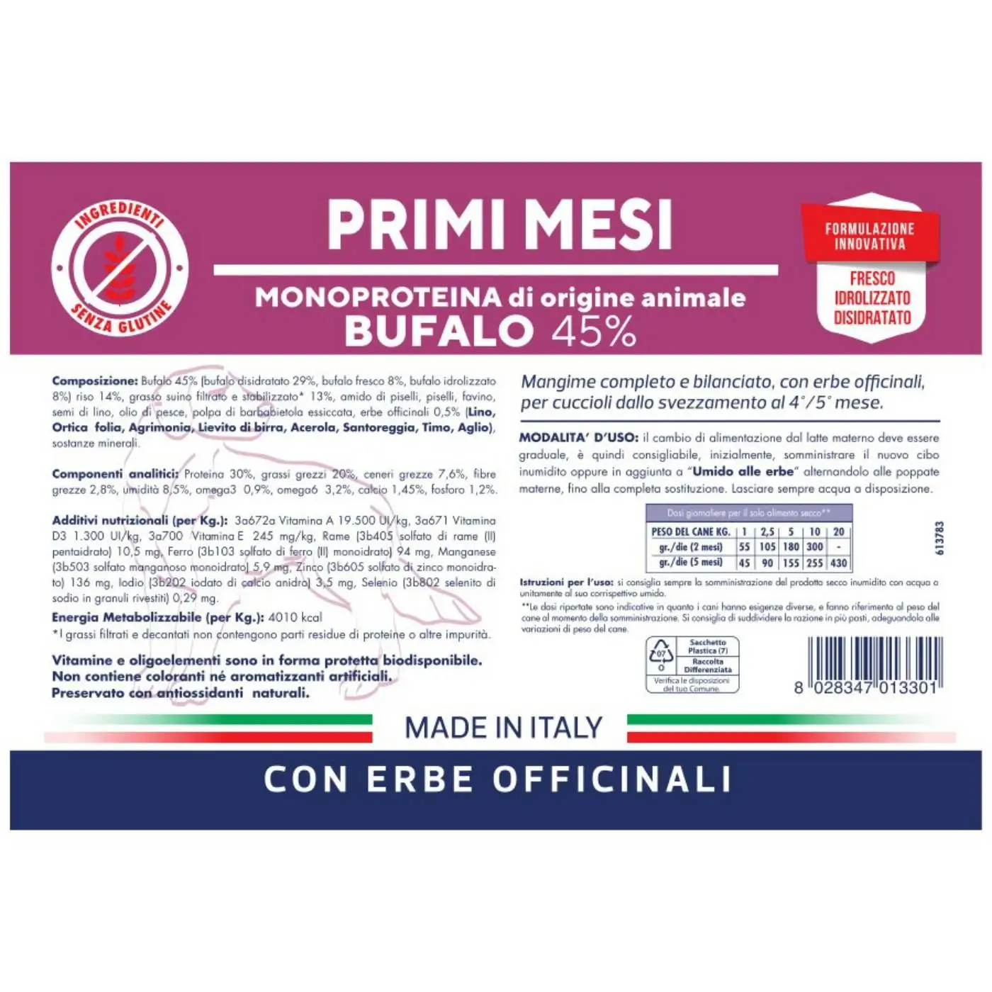 Vet Line Primi Mesi Bufalo per Cuccioli Monoproteico è un mangime secco completo e bilanciato, con erbe officinali studiato per le esigenze nutrizionali dei cani cuccioli dallo svezzamento fino ai 4-5 mesi di età.