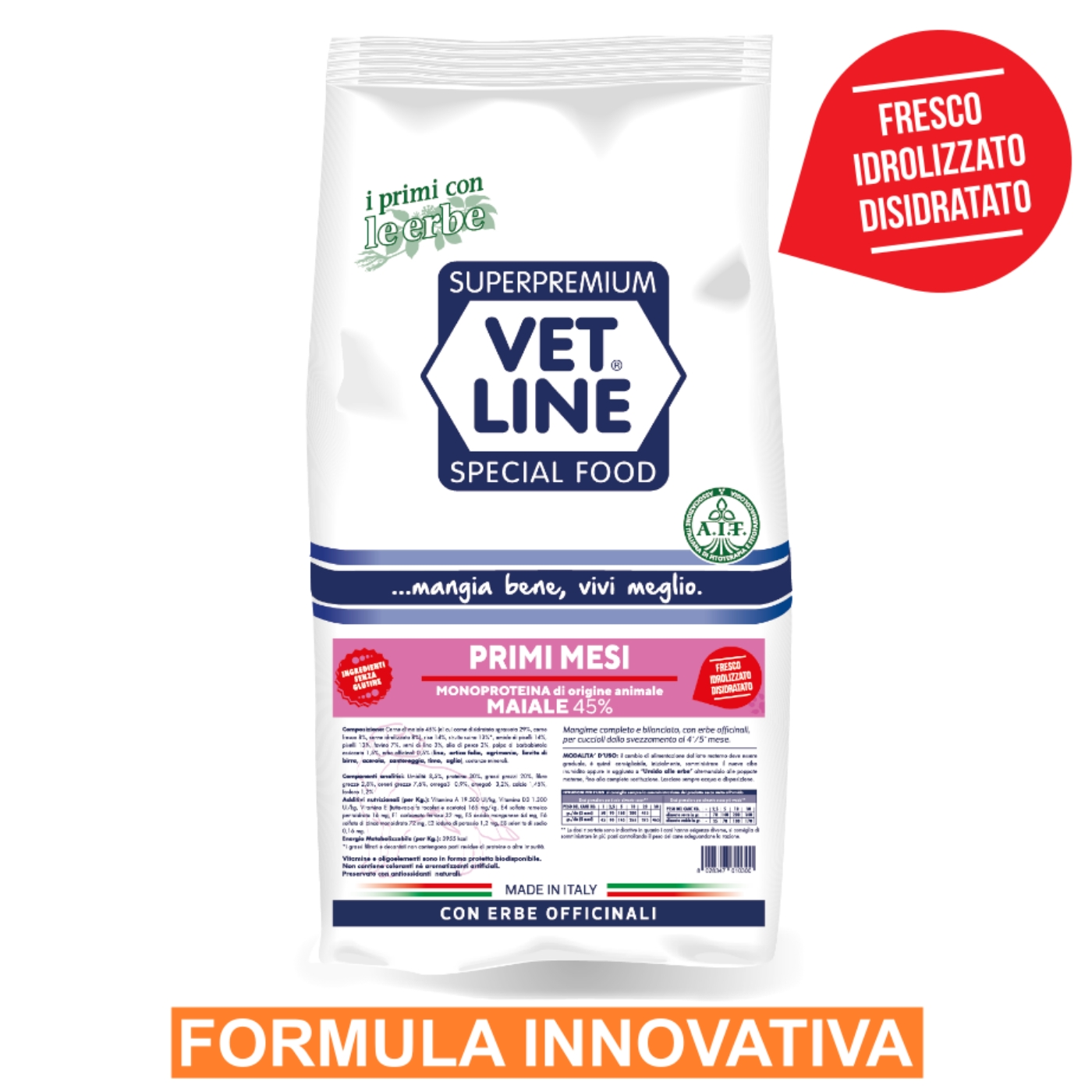 Vet Line Primi Mesi Maiale per Cuccioli Monoproteico è un mangime secco completo e bilanciato, con erbe officinali studiato per le esigenze nutrizionali dei cani cuccioli dallo svezzamento fino ai 4-5 mesi di età.